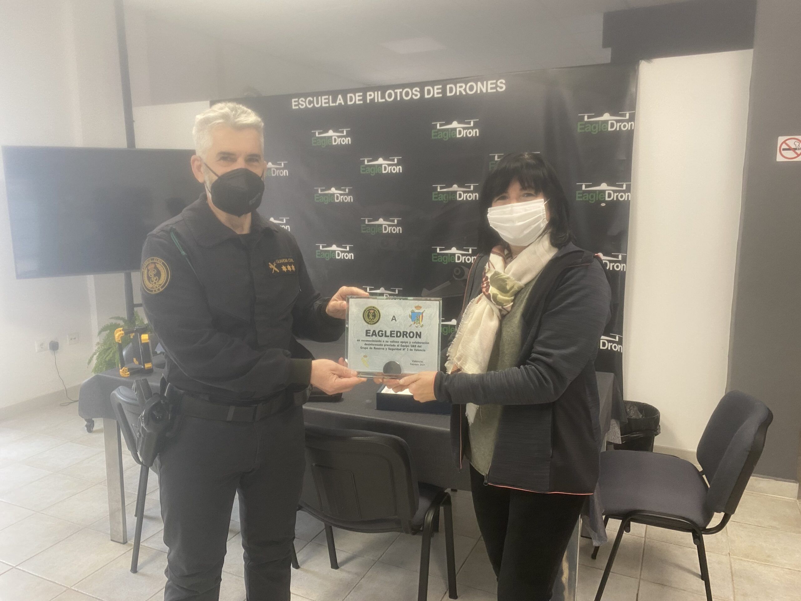 La Guardia Civil ha hecho entrega a EagleDron de una placa de agradecimiento como muestra de la colaboración y apoyo prestado al Equipo UAS (drones) del Grupo de Reserva y Seguridad (GRS) N.º 3 de Valencia.